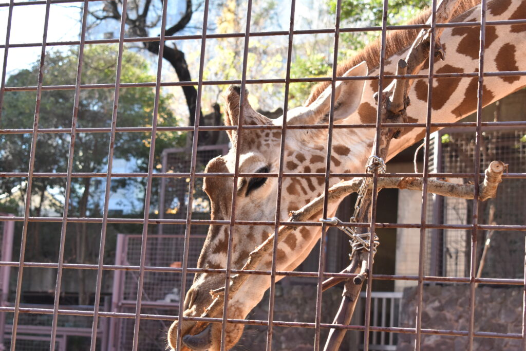 その後『アフリカの動物』エリアへ向かいます。そこでは、「キリン」が木の枝を口でくわえて、柵の近くまで近づいて来ました。