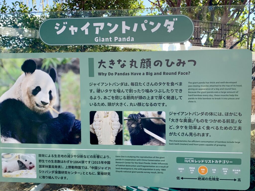 先月、【上野動物園】へ出かけてきました。お目当ては、中国へ返還となる「ジャイアントパンダ」を見るためです。お昼前に動物園の正門前に着くと、残念ながらパンダの観覧受付は終了したことを知らせる看板がありました。受付の方が言うには、開園時間前の朝早くから何百の人達が待っていたとの事でした。せっかく来たので、他の動物たちを見ようと、西園の方へ向かいます。不忍池の前に「パンダの大きな丸顔について」が書いてある看板がありました。そこには、パンダの奥歯は、硬い竹を食べる為に「大きな奥歯」と「物をつかめる前足」があると書いてありました。この大きな奥歯のおかげで、硬い竹をすり潰して食べることができるそうです。パンダの奥歯に比べると、人間の奥歯は、時には欠けたりするので、パンダのように大きくて丈夫な奥歯があれば良いと思いました。