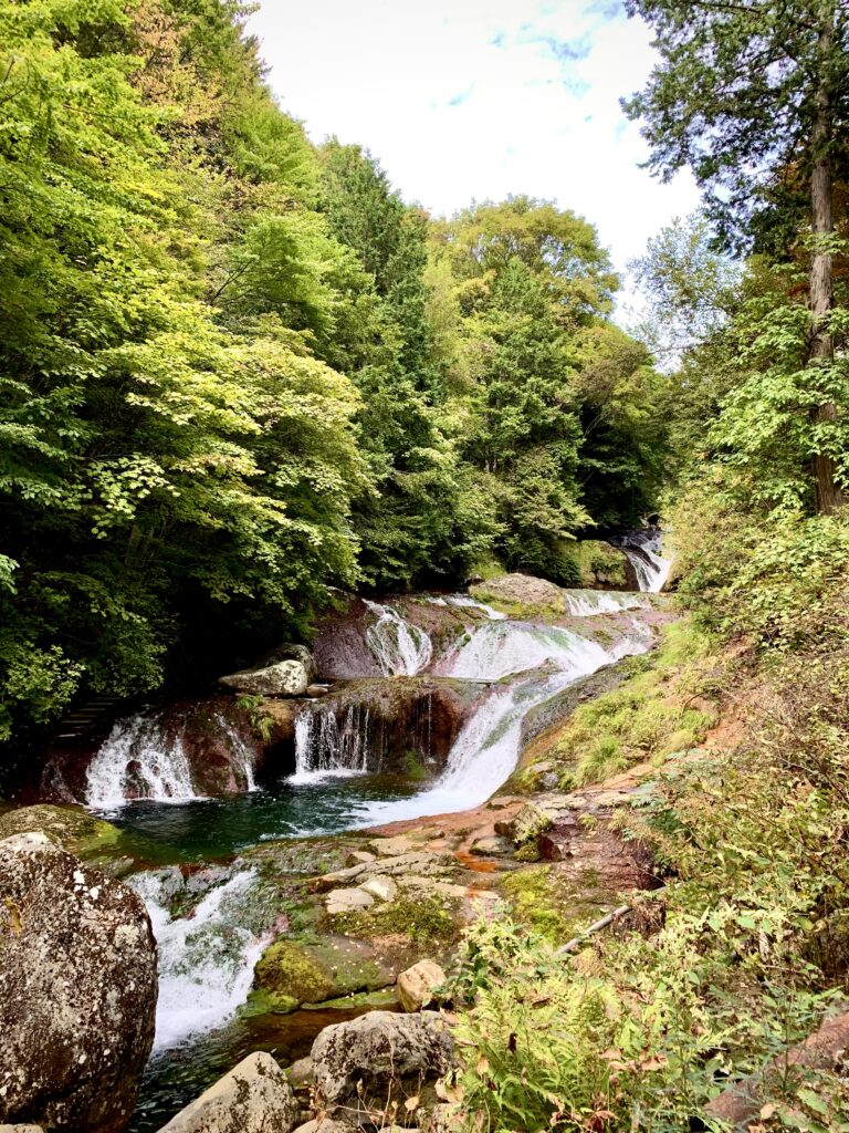 次に、そこから山道を歩いて20分くらいの所にある【おしどり隠しの滝】へ向かいます。 ここは、横谷渓谷の最上流にある滝なので、どんな景色が見られるのかと・・・ワクワクしながら急な山道を下りました。 一番下まで下ると、目の前に温泉旅館が現れました。聞こえる水の音の方へ進むと、急な階段があり、下りた所にその滝はありました。 目の前に現れた、流れ落ちる水の青色と岩肌の赤茶色とコケの緑色のコントラストがとても綺麗でした。また、流れ落ちる水の迫力に、自然の醍醐味を堪能してきました。