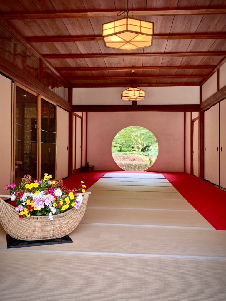 先月、鎌倉市へ出かけてきました。鎌倉は、歴史ある多くの寺社がある古都で有名です。北鎌倉駅を降りると自然豊かな所に、多くの神社仏閣がありました。まずは、アジサイが有名な【明月院】へ。ここは、梅雨の季節には、境内一面が青色のアジサイが咲く景色から“明月院ブルー”とも呼ばれています。明月院の石段を登りきると、本堂が見えました。ここにある“丸窓”は『悟りの窓』ともいわれ、奥に望む庭園の風景を鑑賞することができます。今回は、紅葉前の緑色の木々が、丸窓の奥に広がっていました。また、日本家屋の趣と手前にある色鮮やかな生け花は、まるで絵画のようで感動しました。円窓から奥に見える幻想的な景色を見ることで、心静めてゆったりとした時を過ごすことができて良かったです。